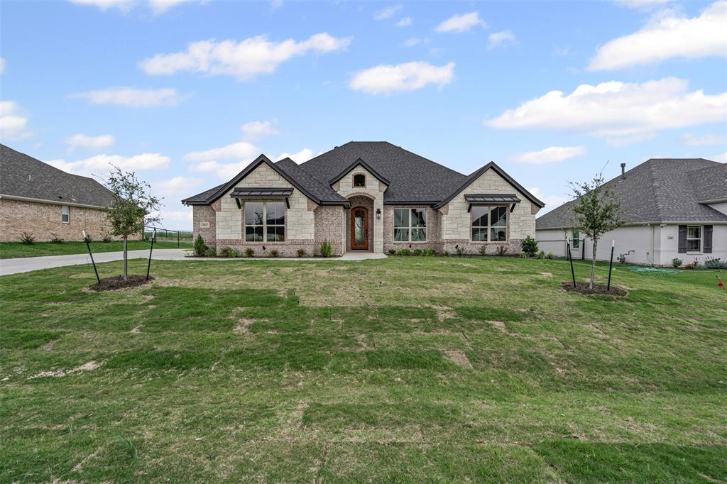 MOVE-IN READY! Located in the gated community of Wildcat Ridge with amenities, you’ll fall in love with this upgraded Al Couto Home designed for comfort and luxury! Step into the elegant living room, where a floor-to-ceiling stone fireplace and detailed crown molding set a refined tone. The chef-inspired kitchen features a striking oversized island, gas cooktop, vent hood, under-cabinet lighting, and a large walk-in pantry. The expansive owner’s suite offers a serene retreat with dual vanities, a free-standing spa-like soaking tub, an oversized walk-in shower, and a generous closet with seasonal storage. A separate utility room with built-in cabinetry adds everyday convenience. Enjoy peaceful evenings on the spacious covered patio, perfect for watching stunning Texas sunsets. This meticulously crafted home also includes energy-efficient FOAM insulation, epoxy garage floors, EV charging station, and thoughtful design throughout. Community amenities include a park, pond, pool, and pavilion. Conveniently located just minutes from the Chisholm Trail Parkway.