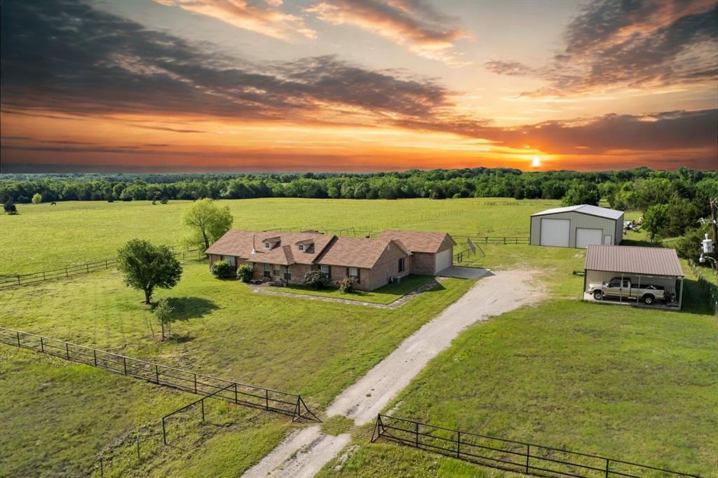 Dreaming of wide-open spaces, breathtaking sunsets, and a retreat designed for livestock and workshop enthusiasts? This 32-acre Texas ranch is the perfect blend of function and tranquility, offering everything you need for raising animals, storing equipment, or running a business from home. With an AG exemption already in place, the land is fully cross-fenced with no-climb fencing, featuring side and rear gates for easy access and livestock separation. Two spacious metal workshops provide endless possibilities. The 40×50 shop is fully insulated with spray foam and includes two 14ft automatic pull-through doors, making it ideal for storing an RV, large trailers, or heavy equipment. The 20×30 shop features a roll-up door and two overhang carports, perfect for additional storage or workspace. Whether you need room for tractors, feed, or a place to work on projects, these shops deliver both convenience and efficiency. At the heart of the property is a custom-built ranch home with a split floor plan offering 3 bedrooms, 2 bathrooms, and an oversized game room. The open-concept living area flows into a kitchen with stainless steel appliances, ample counter space, and stunning views from every window. The primary suite is a true retreat, featuring a walk-in closet, garden tub, dual sinks, and separate shower. With stained concrete floors and custom molding, the home combines rustic charm with modern convenience. Step outside to a large covered patio with a swing, where you can sip your morning coffee and overlook your land. You’ll enjoy the electric front gate to the property, 150amp house plug, high impact roof replaced in 2017, interior paint in 2024, and 22 acres already AG-exempt. Located just one hour from the DFW metroplex, this property is ideal for livestock owners, show competitors, or anyone needing ample workshop space. With easy access to Texas, Oklahoma, Arkansas, and Louisiana livestock events, this ranch is a rare find.