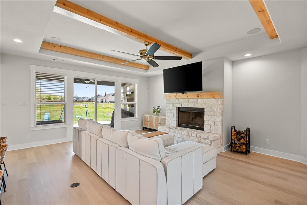 Build in 2023, this modern gem blends style space and functionality in every detail. Featuring four spacious bedrooms and three full bathrooms, this thoughtfully designed home offers a comfortable layout perfect for everyday living and entertainment. Step inside to find light wood flooring flowing through the main living areas complimented by natural paint tones and finishes that create a warm, timeless feel. The heart of the home is the expansive open-concept kitchen and living area, framed beautifully with 3 striking wood beams overhead, adding character and architectural interest. Enjoy the convenience of a central vacuum system throughout the entire home, making clean-up a breeze. Outside, you’ll love relaxing or entertaining on either one of the two covered patios- front and back. Whether you are sipping coffee on the front porch or hosting a BBQ in the backyard, this home offers the perfect blend of charm and modern convenience.
